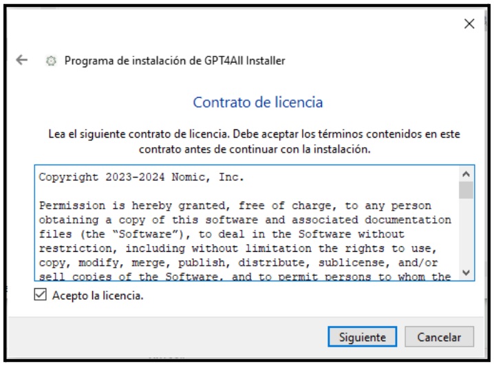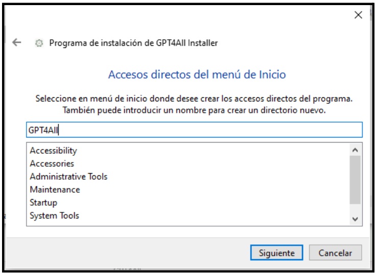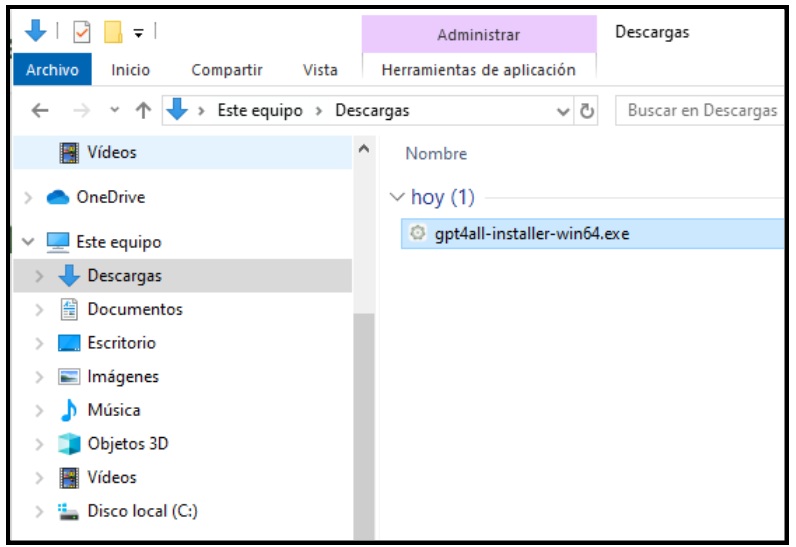 Durante la instalación, y para tener los ficheros necesarios ordenados y localizados en una única ubicación identificable en vez de en varias carpetas dispersas en el disco duro, hemos creado previamente una carpeta “C:\GPT4All” al efecto.