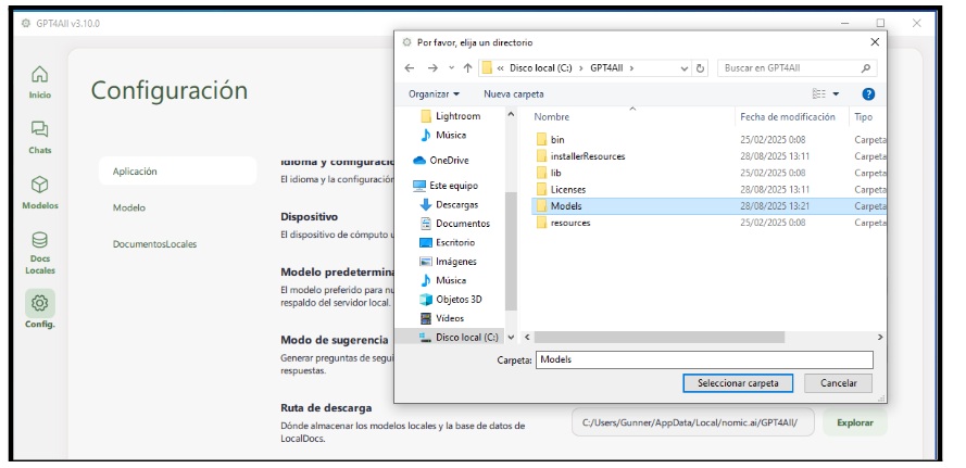 Modificaremos también la ruta de descarga de los modelos de razonamiento que vamos a utilizar. Elegiremos una subcarpeta de la carpeta que previamente también habremos creado en la ruta que indiqué en el paso previo de la instalación del producto. En nuestro caso “C:\GPT4All\Models”.