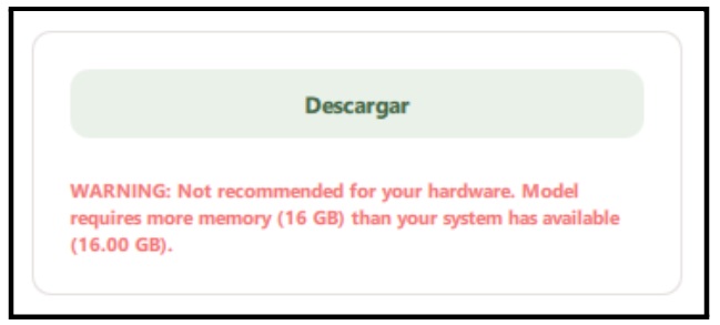 En nuestro caso, elegiremos DeepSeek dado que se trata de un modelo de razonamiento sin restricciones de uso, con unos requerimientos de RAM razonablemente moderados y de una adecuada complejidad/profundidad de razonamiento. Pulsamos sobre “Descargar”: