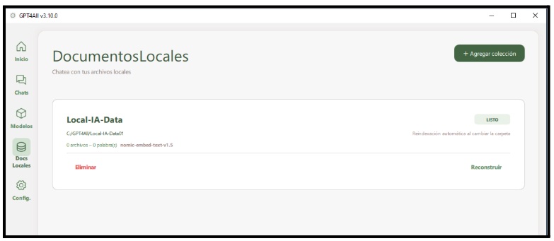 En nuestro caso “C:\GPT4All\Local-IA-Data01”, observen que he añadido la coletilla “01” puesto que podríamos tener varios DataSet en función de nuestras necesidades. Pulsamos sobre “Crear colección”. Obtenemos el siguiente resultado.